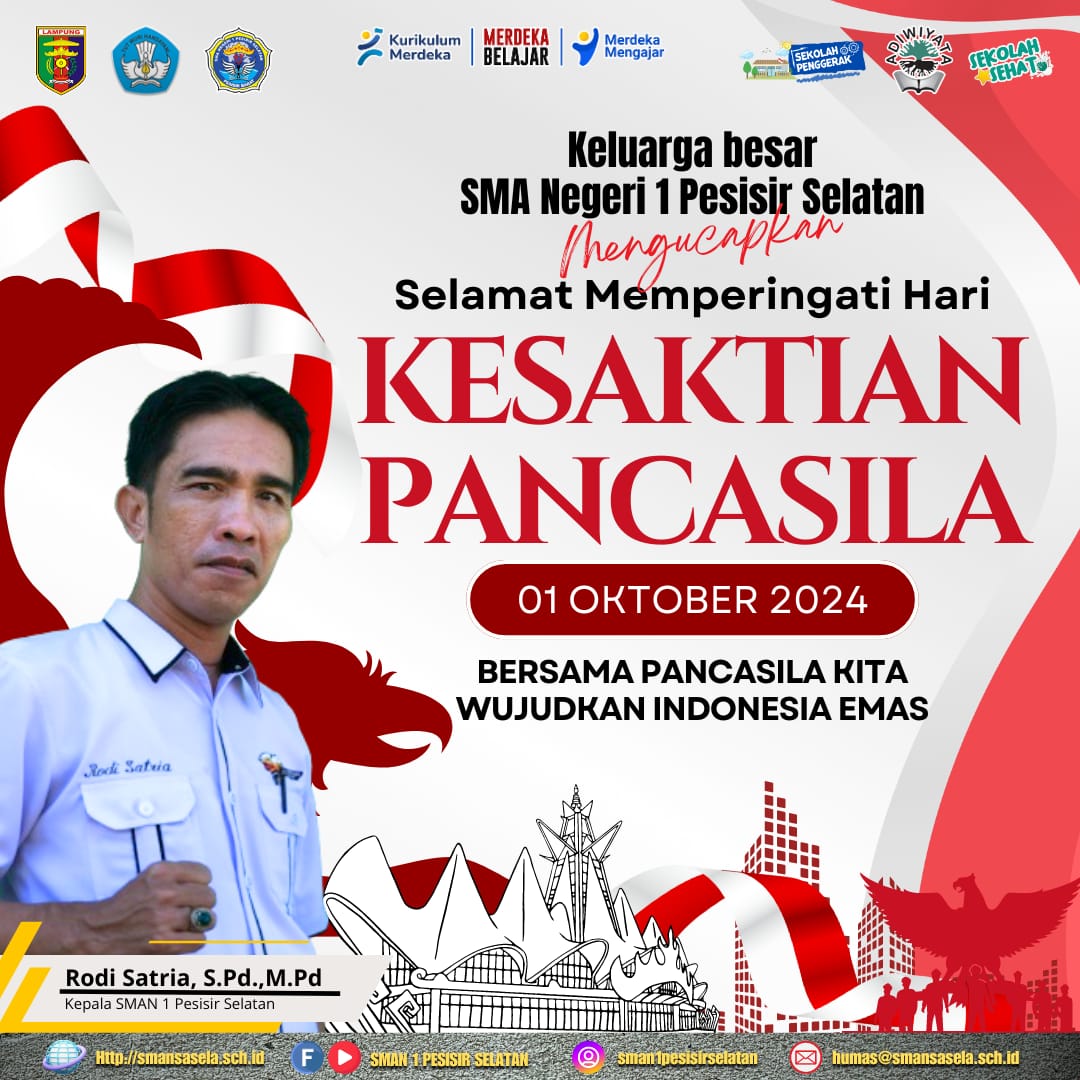 Dalam rangka memperingati Hari Kesaktian Pancasila, SMA Negeri 1 Pesisir Selatan juga turut serta dalam memperingati hari ini. Kepala Sekolah SMA Negeri 1 Pesisir Selatan, Bapak Rodi Satria, S.Pd., M.Pd., menyampaikan ucapan selamat Hari Kesaktian Pancasila kepada seluruh siswa, guru, dan staf sekolah.